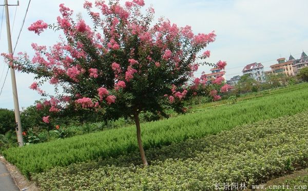 紫薇在園林中使用很普遍,因其開花時間為雨季,是缺花氣候,粉色花蕾格外亮麗,給酷熱的雨季帶去一些涼爽,是私家園林欣賞的好種類材料。紫薇可用于栽植花鏡,圖形,街道綠化,小區綠化,公園綠化等,見效快,緩苗期短暫,綠化效果好。另外它也也能夠與很多種園林苗木組合應用,創造各種景觀,比如與龍柏,美人梅,高山黃楊,八仙花,叢生紫荊,紫羊茅,菊花苗,大葉黃楊,金葉女貞蔥蘭,黃槽竹,鋪地柏鉛筆柏,馬尾松,四季凌霄,塔柏球,垂枝梅,刺梅花,月季樹等一塊栽植。